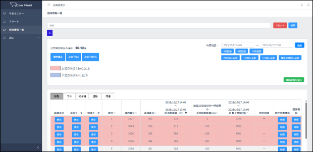 牛の移動距離、過去の平均移動距離、静止時間を他の牛と比較することができ、発情・疾病牛が発見しやすくなります。