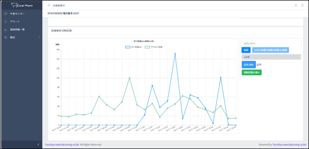 牛の移動距離をグラフで表示でき、過去のデータから発情・疾病を見つけやすくなります。
